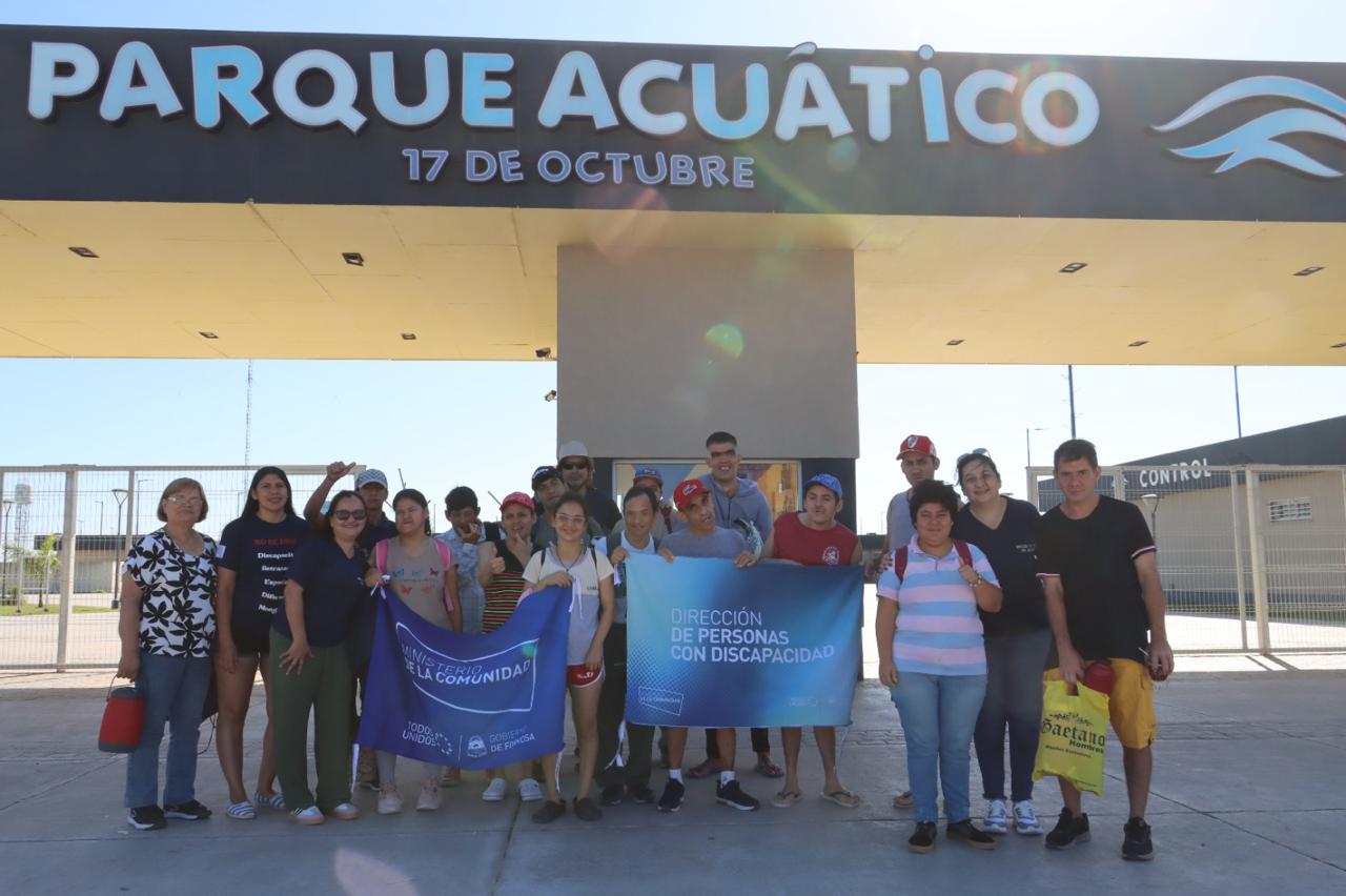 Personas con discapacidad residentes en los hogares “Refugio de Amor” y “Refugio de Alegría”, junto a usuarias y usuarios de las distintas sedes del Centro Ocupacional Inclusivo (COI), participan activamente de la colonia de vacaciones que se desarrolla en el Parque Acuático “17 de Octubre”, en la ciudad de Formosa.